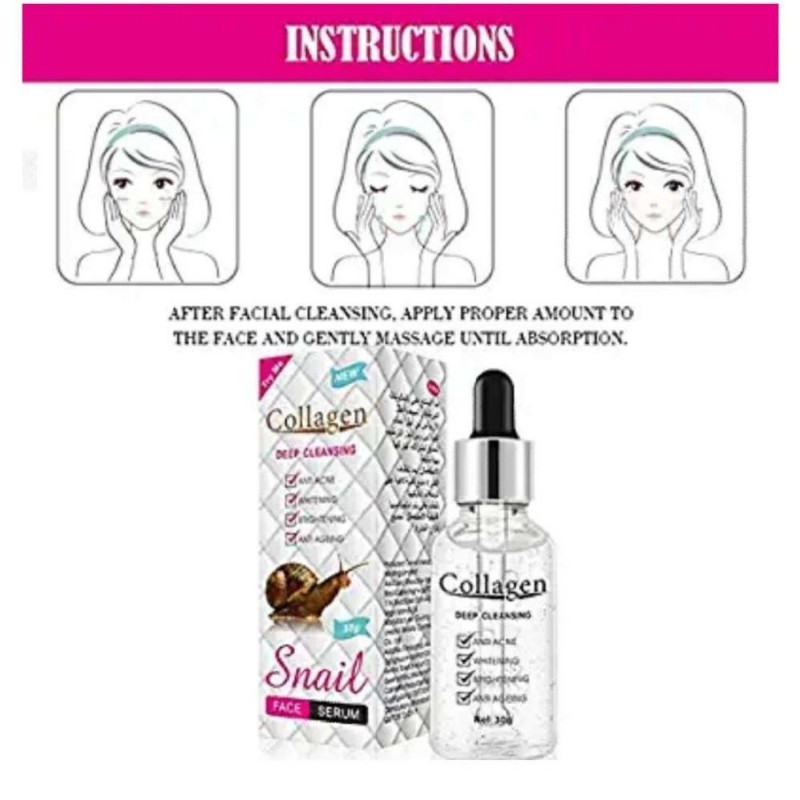 Snail Collagen Face Anti Acne Whitening Skin Care SerumCollagen & Snail স্কিন এর এক ধরনের ফুড।এটি স্কিন ব্রাইটিং এবং ব্রুন এর সমস্যা, এন্টিএজিং,টাইনিং,গ্লোয়িং,পোর মিনিমাইজিং এর জন্য বিশেষ উপকারি।কার্যকারিতা :ত্বকের কোলাজেন বৃদ্ধি করে এবং মেলানিন হ্রাস করুন।নিস্তেজ ত্বকে glow ফিরে আসে।কয়েক গুণ উজ্জ্বল করে।ত্বককে ময়শ্চারাইজ করে, ত্বকের গঠন উন্নত করে।অ্যান্টি-রিঙ্কেলস হিসেবে কাজ করে।বলিরেখা দূর করে।পোর সঙ্কুচিত করা।দাগ দূর করা।স্কিন এর dullness দূর করে।ত্বকের testure বৃদ্ধি করে এবং ত্বকের self re-pairing ক্ষমতা বাড়ায়।Snail collagen whitening serum Again restockWhiteningBrightningAnti acneAnti ageing[How to use]1. Cleanse the face, apply Hyaluronic Acid Serum liquid.2. Reapply it to the positions exposed to fine lines.3. Gently apply from the bottom up, and inside to outside with finger pulps.4. Gently massage the face with the palm for a better absorption.[Net weight]30ml