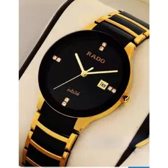 Special featuresGold PVD stainless steel bracelet with black ceramic center links Round case, 28mm, black bezel Black dial with gold-tone hands, logo, date window and diamond markers at three, six, nine and twelve o'clock Swiss quartz movement