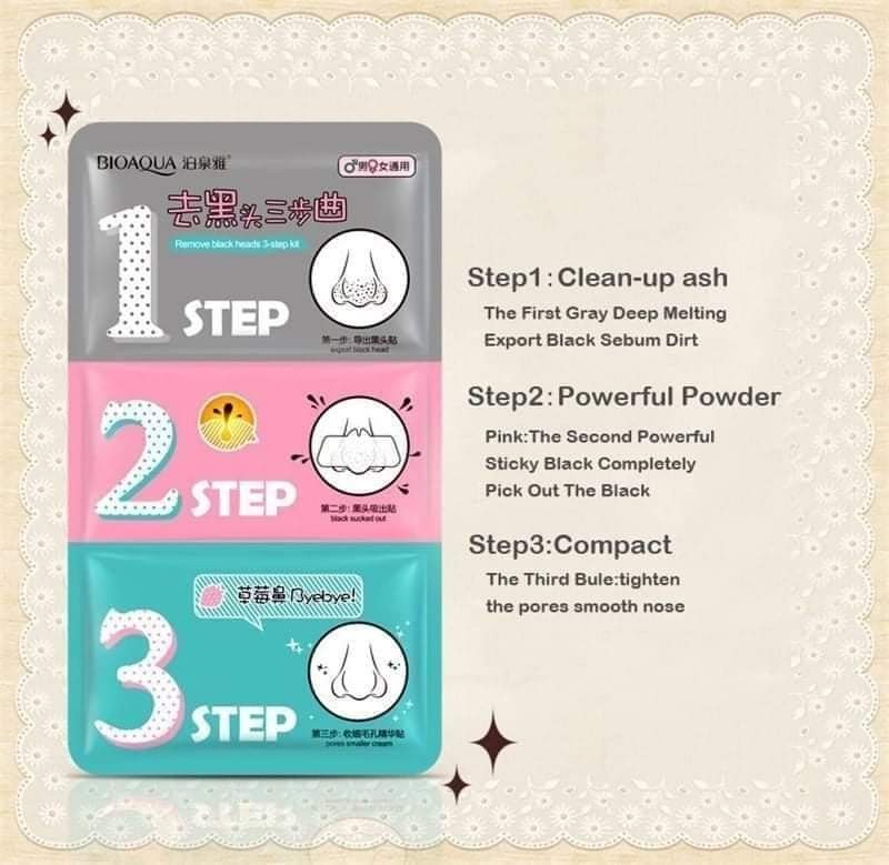 How to Use: After cleansing, place step-1 on nose for 15-20minutes. Remove it slowly and wipe off any blackhead or impurities from nose. Wet nose with water and place step-2 on nose. After 10-15 minutes and slowly remove it from the edge. After step 1 & 2, place step-3 on nose. Remove it after 10-15 minutes and gently tap it for better absorption.