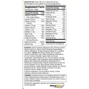 Ingredients: Calcium Carbonate, Magnesium Oxide, Potassium Chloride, Ascorbic Acid (Vit. C), Dibasic Calcium Phosphate, Microcrystalline Cellulose, Maltodextrin, DL-Alpha Tocopheryl Acetate (Vit. E), Modified Corn Starch Contains Less than 2% of: Beta-Carotene, BHT (to Preserve Freshness), Biotin, Blue 2 Lake, Calcium Pantothenate, Cholecalciferol (Vit. D3), Chromium Picolinate, Copper Sulfate, Corn Starch, Crospovidone, Cyanocobalamin (Vit. B12), Ferrous Fumarate, Folic Acid, Gelatin, Hypromellose, Lutein, Magnesium Stearate, Manganese Sulfate, Medium-Chain Triglycerides, Niacinamide, Phytonadione (Vit. K), Polydextrose, Potassium Iodide, Pyridoxine Hydrochloride (Vit. B6), Red 40 Lake, Riboflavin (Vit. B2), Silicon Dioxide, Sodium Ascorbate (to Preserve Freshness), Sodium Molybdate, Sodium Selenate, Talc, Thiamine Mononitrate (Vit. B1, Titanium Dioxide, Tocopherols (to Preserve Freshness), Vitamin A Acetate, Zinc Oxide.