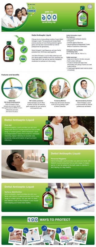 Dettol Antiseptic Liquid can be used for household disinfectant (in laundry, on floors, surfaces, or lavatories). Do not use on the broken skin or wounds.Proven within 5 minutes of contact to kill a wide range of germs, including Bacteria & fungi: E.coli, Salmonella, Listeria, Staph. aureus, E.hirae, Pseudomonas aeruginosa, Vibrio cholera, Candida albicans and Viruses: Influenza type A2, Herpes Simplex Virus Type 1. Recommended by Doctors of Bangladesh Private Medical Practitioners Association (BPMPA).