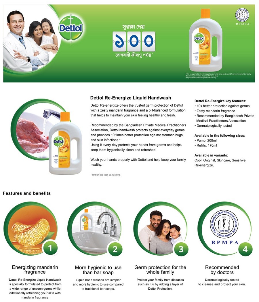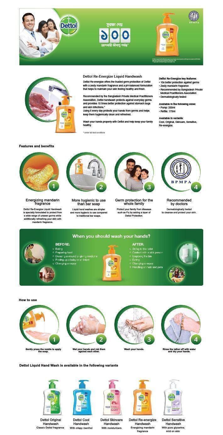 Dettol hand wash Re-energize liquid soap comes with zesty mandarin. Dettol hand wash gives 10 times better protection against stomach bugs & skin infections. Be 100% sure with Dettol's trusted protection from a wide range of unseen germs. Dettol is recommended by Doctors of Bangladesh Private Medical Practitioners Association (BPMPA). Dettol & Sword devices are registered trademark of Reckitt Benckiser Group PLC. Dettol is protecting health for over 80 years and is used 2 billion times each day in over 124 countries. Dettol Hand wash in Bangladesh is manufactured and marketed by Reckitt Benckiser Bangladesh Limited.