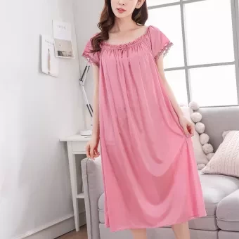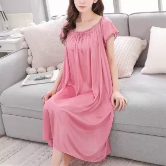Product details of LouisWill Women Nightdress Loungewear Satin Pajamas Long Dress Short Sleeves Robe Lace Round Neck Dress Sleepwear Nightwear Set Plus Size Home Dress