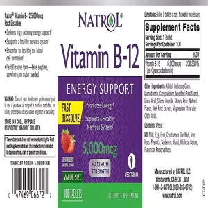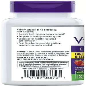 Specifications of Natrol Vitamin B12 Fast Dissolve Tablets, Promotes Energy, Supports a Healthy Nervous System, Maximum Strength, Strawberry Flavor, 5,000mcg, 100 Count, USA SKU: dq-fsMV406