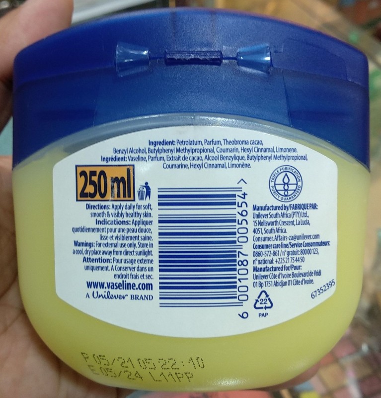 Specifications of Petroleum Jelly BlueSeal Cocoa Butter 250 ml SKU: dq-scLBT384