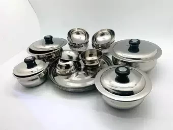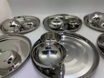 Stainless Steel Non-Mangetic 26 Pcs Dinner Set Lotus soup bowl- 6 pcs Dal bowl - 6 pcs Rice Plate - 6 pcs Serving Hari - 4 pcs Serving hari lids - 4 pcs.