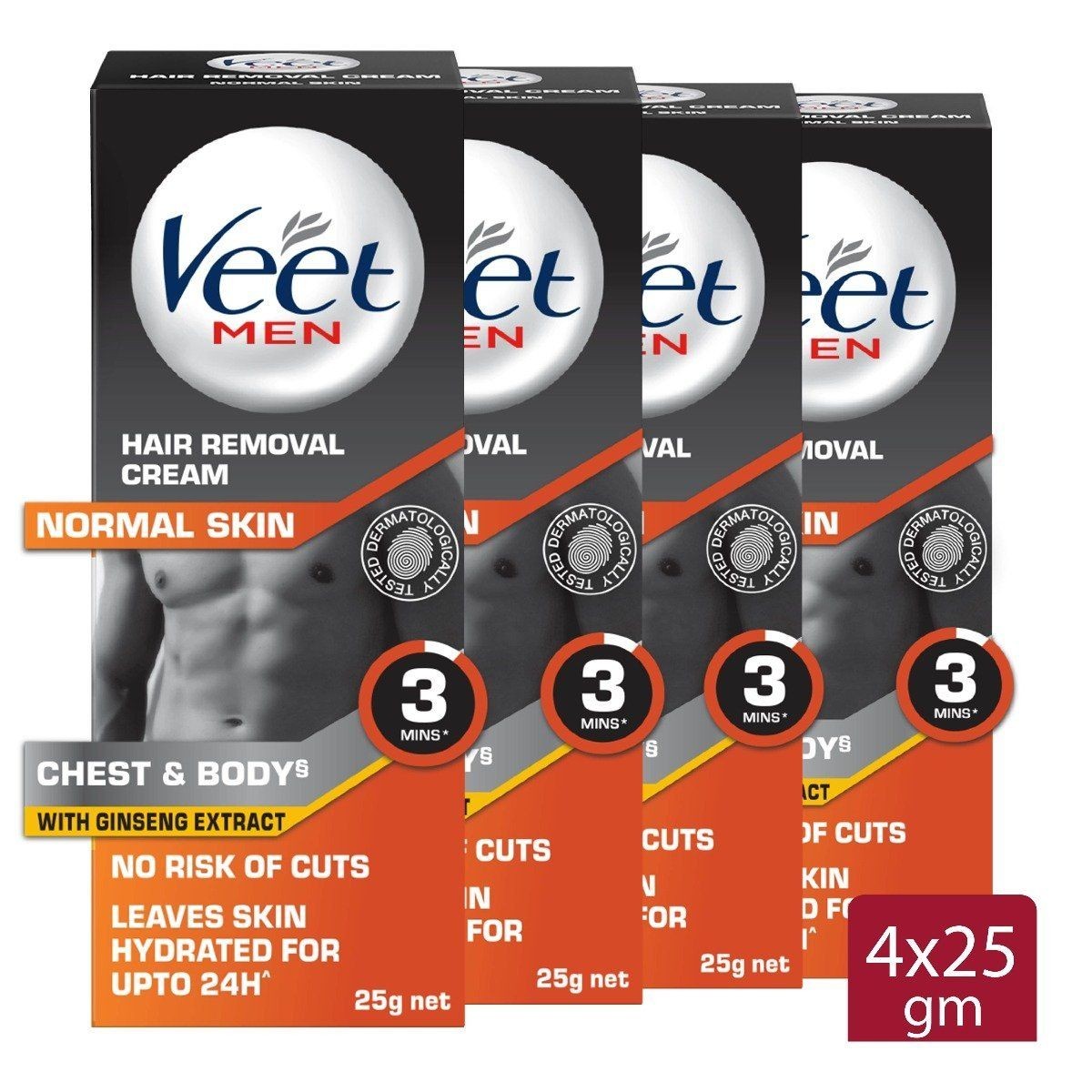 Veet Men Quad Pack Hair Removal Cream Normal Skin (25gm X 4)- for Chest, Arm, Leg & Armpit with Ginseng Extract, No Risk of Cuts