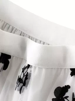 Product details of Women Tutu Tulle Skirts, Elastic High Waist Floral Print Mesh Overlay Layered A Line Midi Skirt
