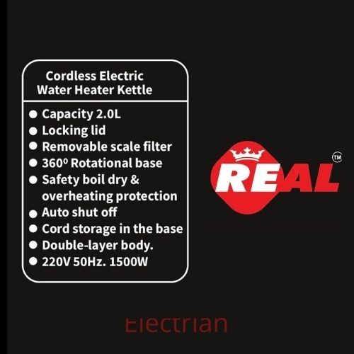Real Electric Water heater kettle-2 Litter*Capacity 2.0L*Locking lid*Removable scale Filter*360' Rotational base*Safety boil dry & overheating protection*Auto shut off*Double-layer body*220V50Hz.1500W* Color - Royal Red *6 Months Service Warranty
